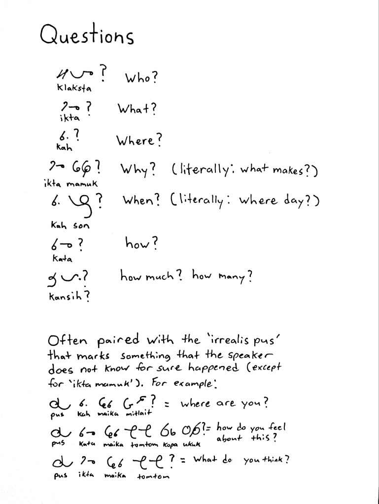 I would also like to add a special note about “When?”. The expression ‘kah son?’ is really referring specifically what day something happened – though personally I think we could get away with using it to generally mean “when?”. You will not find that ‘kansih’ (Grand Ronde spelling = qʰənchi) means “when?” in Chinuk Pipa documents at least. This is a Southern meaning of the word.