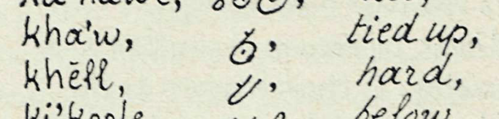 This system follows several of the Indigenous languages of British Columbia by representing those sounds you pronounce in the back of your throat with an underline. This includes ḵ and ẖ. You can see both of these in the example above written as “kanawei-ḵaẖ”. Also that slurpy noise you heard at the start of “kloshe” above (aka a lateral fricative or sometimes an affricate as well) follows the historic spelling of “tl”. You can see that in the word “tlaska” above and also the ejective form in the word spelled “tl’ap”. These words sound like this: