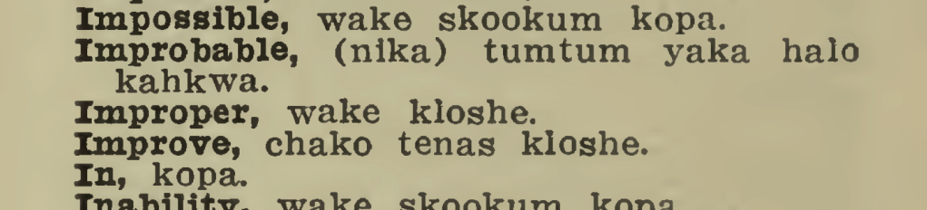 One of the greatest difficulties for beginners in learning Chinook Jargon is that, historically at least, there are almost as many ways to write it as there are speakers. This stems from the fact that Chinook has until recently been almost an entirely spoken language without a standardized writing system. This proves to be a hurdle at the start of your studies, but rest assured that you will overcome it eventually. With that in mind though, what are these ways of writing? Or at least what are the major ways of writing this language, what are the ways that are currently used, and how should you write?