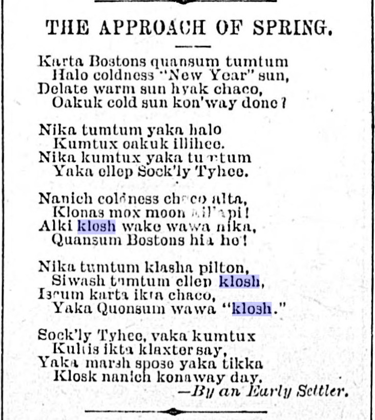 If you’ve ever tried to translate poetry into Chinook, you’ll know that it’s a difficult ask. Although settlers have often been interested in trying to make poetry in Chinook happen, it’s sort of like trying to fit a square peg into a round hole and it’s not something I’ve ever been that interested in.